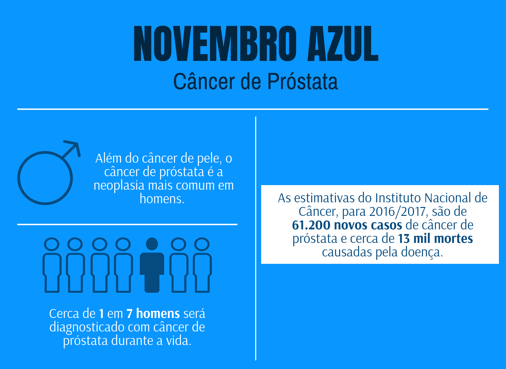 O câncer de próstata protagoniza as campanhas e os cuidados durante o Novembro Azul. No total, são mais de 60 mil casos diagnosticados por ano, o terceiro maior número de mortes causadas por doença em homens. Apenas o câncer de pulmão e o câncer colorretal causam mais vítimas masculinas. Além disso, o câncer de próstata é o 6º maior em número de ocorrências no mundo todo.